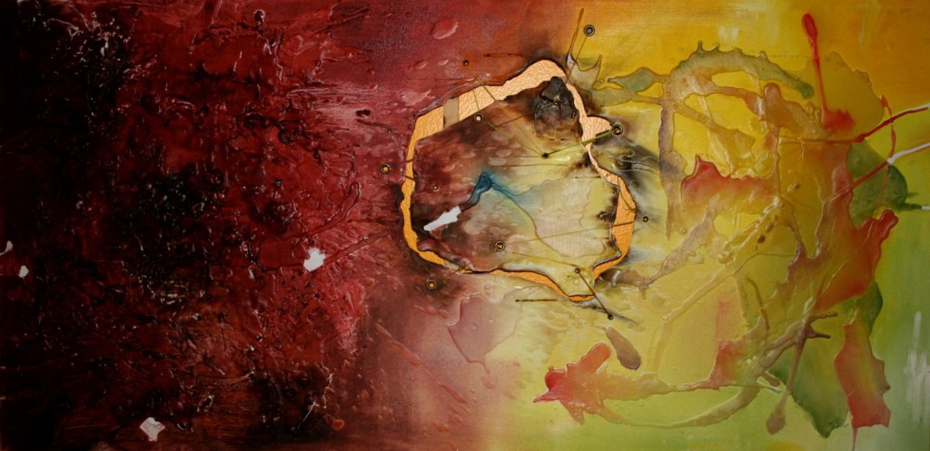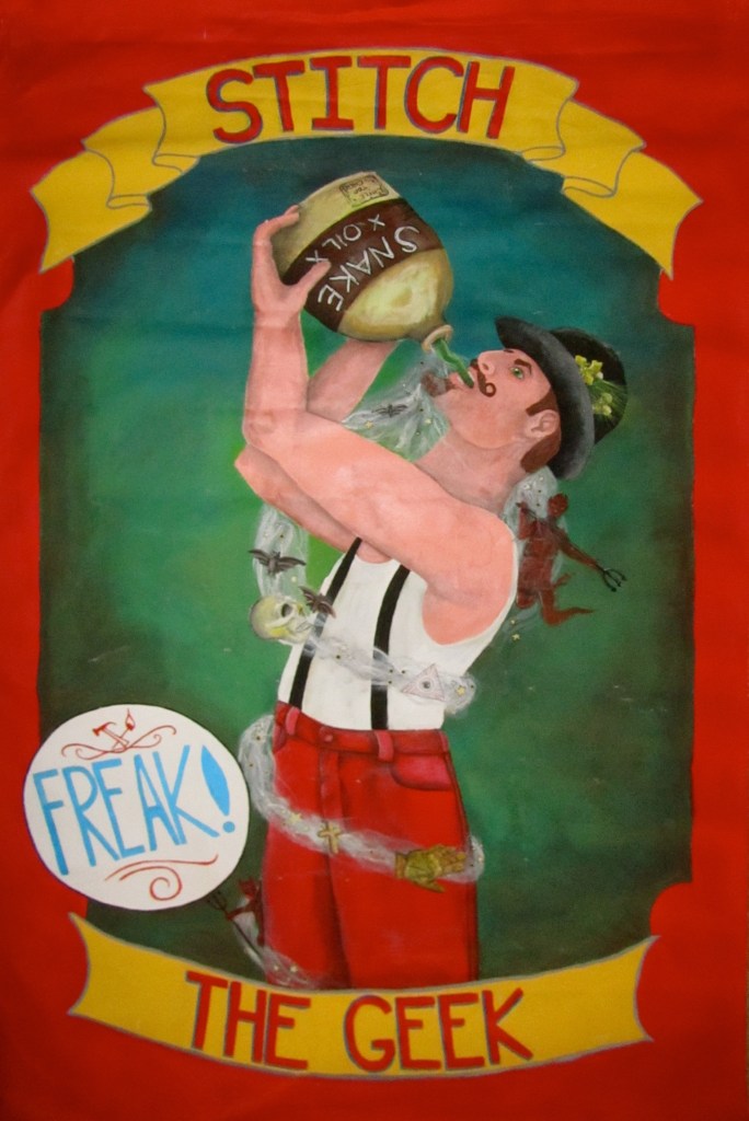 painting :{ Oil & Acrylic }: :{ watercolor }: :{ sideshow banners }: Used for The LittleTop Circus & Medicine ShowRaw Canvas, Acrylic approx 6 ft x 3 ft :{ abstract mixed media }: Oil Paint, Wax, Embroidery Thread Share this: Share on X (Opens in new window) X Share on Facebook (Opens in new window) Facebook Like Loading...